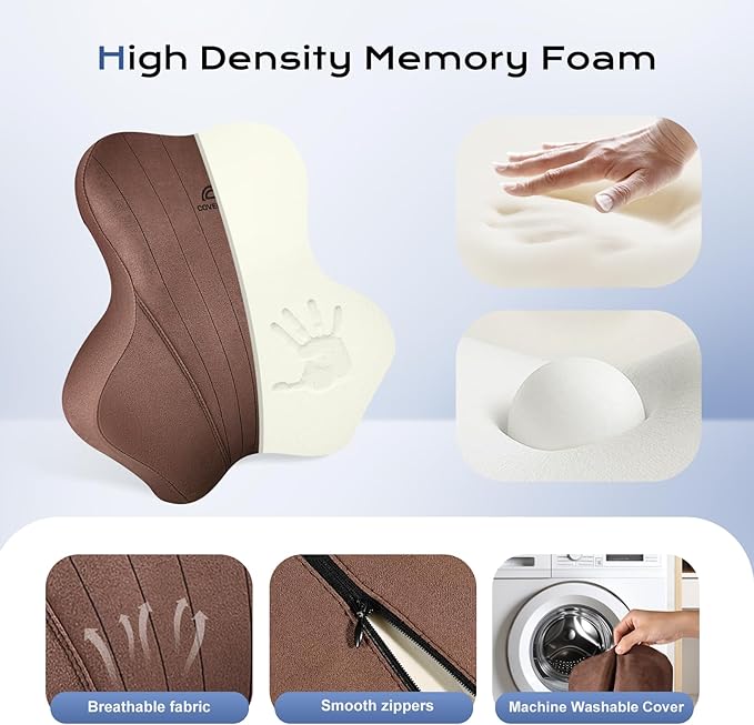 Coverado Car Lumbar Support Pillow and Car Neck Pillow Kit, Ergonomic Design Car Headrest Pillow for Driving, Relax Back Head Muscles Relieve Driving Fatigue, Breathable & Removable Cover, Coffee