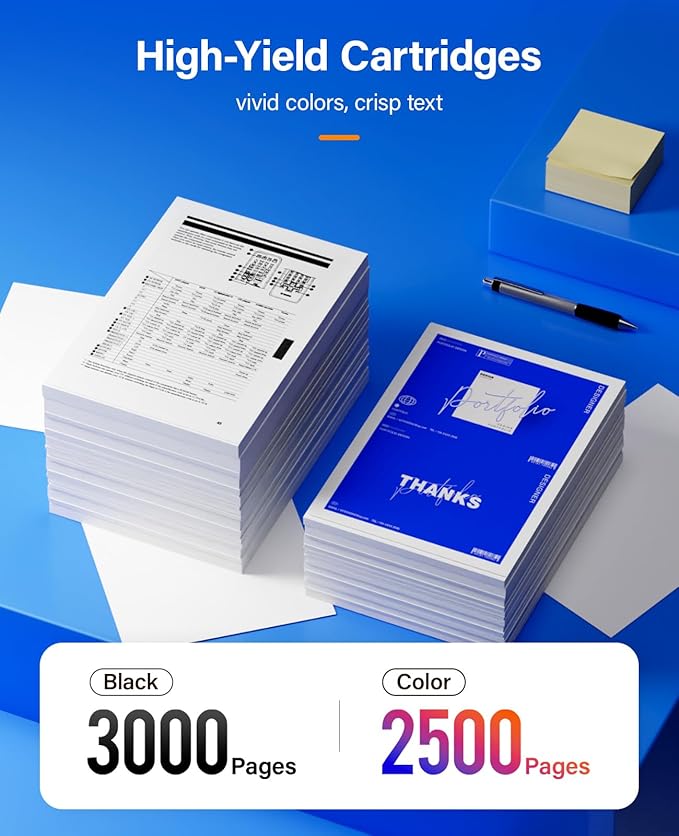 - Page Yield: Up to 3,000 pages per black cartridge and 2,500 pages per color cartridge at 5% coverage (Letter/A4).