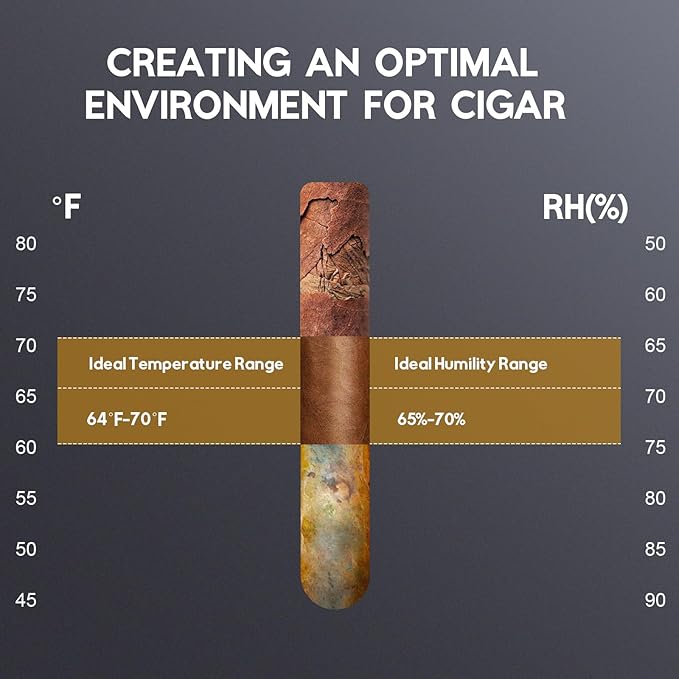 - 【170 Cigar Capacity & Safety Lock】This electric humidors for cigars has a large capacity of 25L, which can hold up to 170 cigars (depending on the cigar ring gauge size). Runs noise < 35dB and no vibration, allowing you to enjoy life with peace of mind. Equipped with a safety lock to ensure the safety of your precious collection. Whether for home or business, it fits perfectly with your home style and is suitable for your living room, study, bedroom, wine cellar, or office.