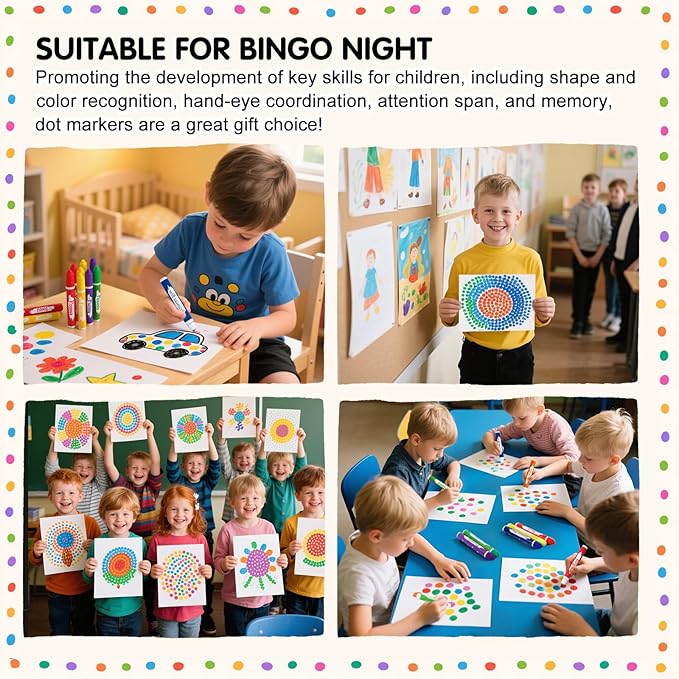 - Versatile Art Supplies: Bingo markers are great for boys and girl to do bingo games, letter recognition, counting and more, an effective number learning activities exercise. From dotting projects to coloring, large areas, they offer endless possibilities for arts and crafts for kid, making them an ideal addition to any preschool or fun home art supply collection