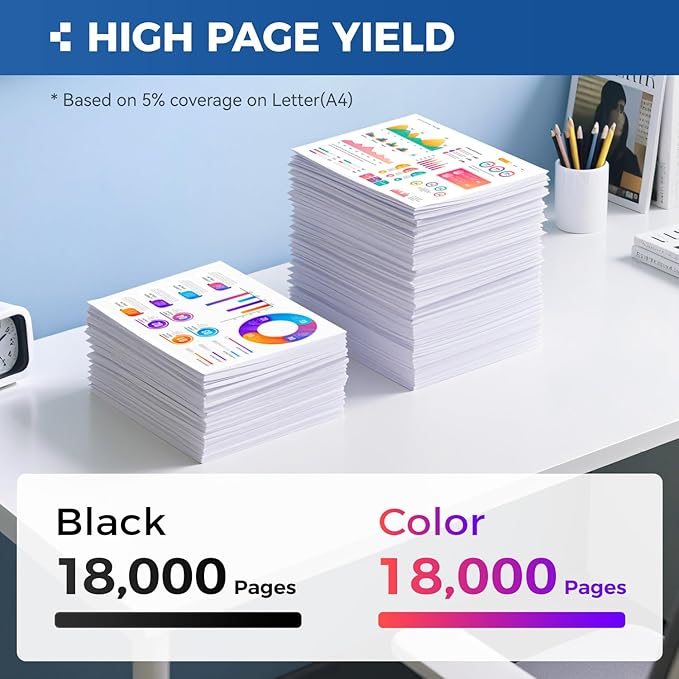 - Page Yield: Up to Black is 18,000 pages per black cartridge and Color is 18,000 Pages per color cartridge (Letter/A4, at 5% Coverage).