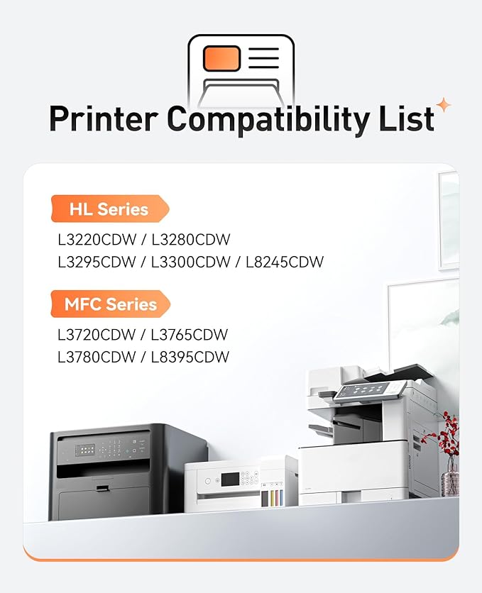 - Compatible Printers: Compatible with Brother HL-L3220CDW HL-L3280CDW HL-L3295CDW HL-L3300CDW HL-L8245CDW Series Printer; MFC-L3720CDW MFC-L3765CDW MFC-L3780CDW MFC-L8395CDW Series Printer.