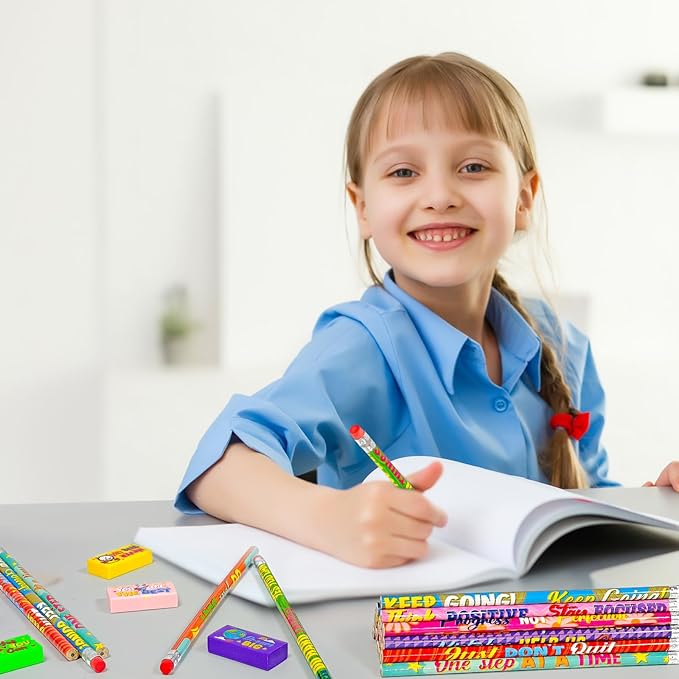 - 100 Motivational Pencil and Eraser Set:Includes 50 inspirational pencils and 50 adorable erasers, perfect for classroom rewards, party favors, or back-to-school surprises. A generous bulk quantity to meet the needs of teachers, parents, and event organizers