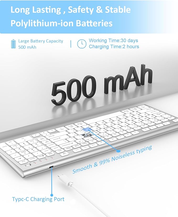 - 【Environmental Protection and Energy Saving】:Never worry about running out of power again! Our high-capacity long-lasting rechargeable battery. The battery capacity is about twice that of most standard wireless keyboards.No more tossing out disposable batteries; it’s eco-friendly and cost-saving. Type C charging port, charging takes about 1.5 hours, with a usage time to about 60 days (depending on usage habits). The smart low-battery reminder ensures you’re always prepared, whether you’re working on a cross-country flight or a long study session.