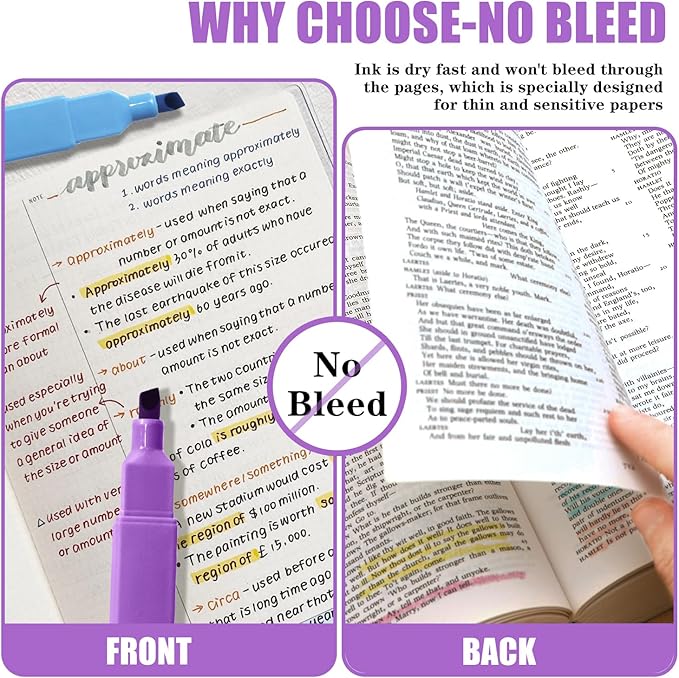 - NO BLEED HIGHLIGHTERS: The highlighters feature durable, quick-drying ink to prevent smears and smudges. The ink is also resistant to fading so your work stays clean and clear for longer. perfect for highlighting your scriptures, notes, journals, or any books you want to read with bright and vibrant colors.