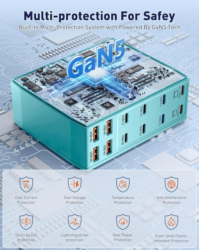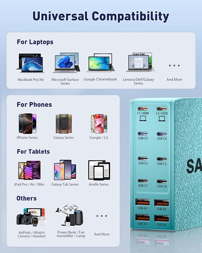 - 【Universal Compatibility】Our USB C charging station is equipped with 2*100W and 2*65W fast charging ports, which can charge 3 or more laptops at the same time. Compatible with smartphones, tablets and laptops, suitable for MacBook Pro/Air, Dell XPS, iPad Pro, iPhone 16/16 Pro Max, iPhone 15 Pro Max, iPhone 14/13 Pro/12 Pro Max, iWatch, AirPods, Surface Pro, Galaxy S24 Ultra, Switch, Steam Deck, Google Pixel and many other devices.