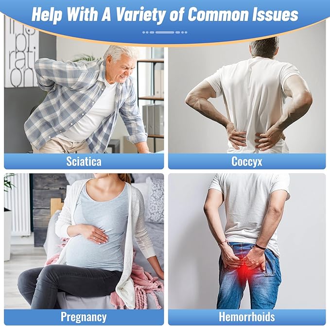- Ergonomic Design: CloudBliss tailbone pain relief seat cushion features an ergonomic "U" shaped gap and center hole that evenly distributes weight, reducing hip pressure when in use and effectively reducing pressure on the tailbone, thus alleviating hemorrhoidal pain and relieving discomfort caused by sitting for long periods of time. Ideal for pregnant women, post-surgery recoveries, office workers and more