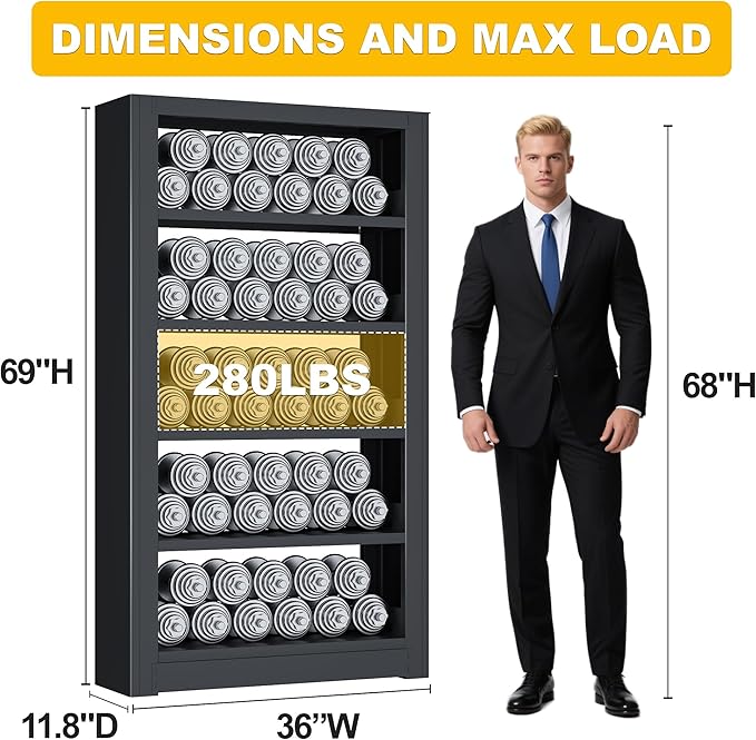 - Heavy-Duty Metal Bookshelf:This industrial-grade steel bookshelf measures 69"H x 36"W x 11.8"D with incredible 280lbs per shelf capacity. The reinforced metal frame and thickened base provide superior stability compared to flimsy wooden bookcases. Adjustable shelves accommodate oversized art books, hardback books, storage bins and heavy collectibles with no sagging.
