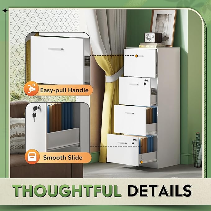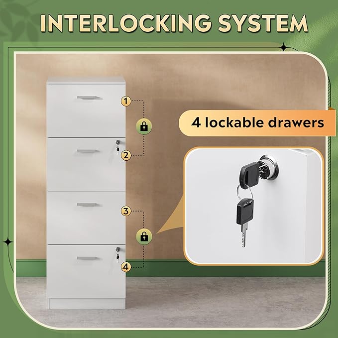 - 【Lockable File Drawers】This vertical filing cabinet includes 2 high-quality double interlocking locks, which ensures that all 4 drawers are lockable. Store your personal items and important documents securely, providing privacy and peace of mind for your home or office.