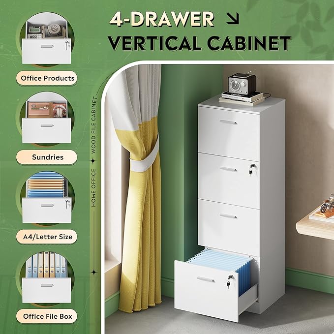 DEVAISE 4 Drawer File Cabinet with Lock, Vertical Filing Cabinet for A4/Letter Size Files, Wood Storage Organizer for Home Office, White