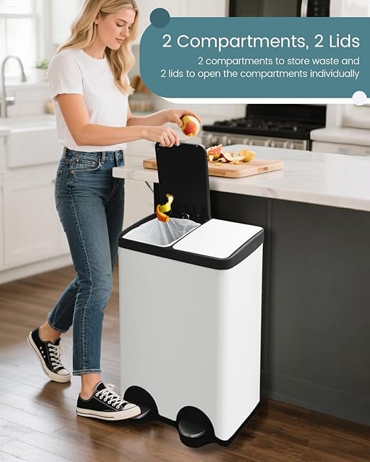 - Dual Compartment Recycling Bin: Two 8 gallon separate bins for waste sorting (trash + recyclables), helping you reduce landfill waste effortlessly.