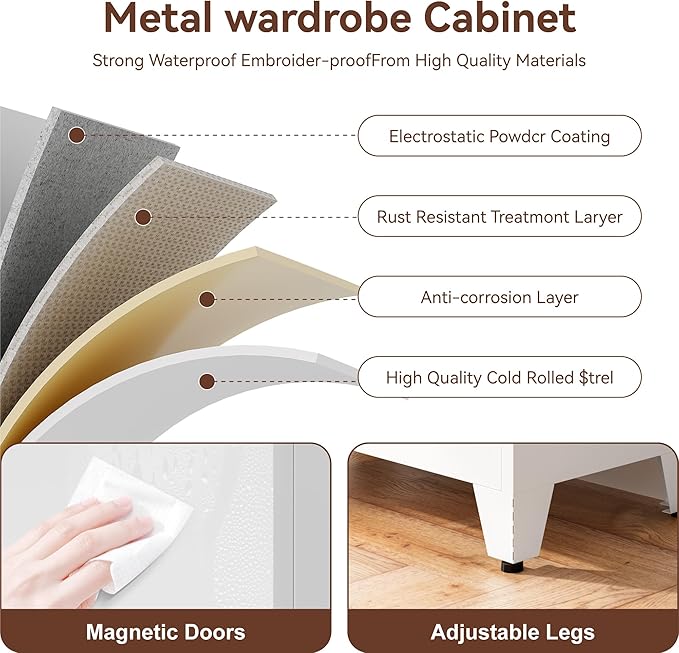 - Robust & Srable :Metal Wardrobe Cabinet is manufactured by a duty steel frame, allows each Drawer able to hold up to 40 pounds ,metal drawer cabinet doesn't smell at any time,Comes with anchor hardware to prevent tipping over or accidents