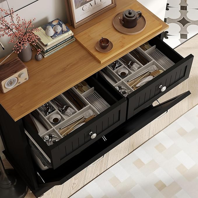 - Multifunctional Storage Hub: More than just a trash cabinet! Use it as a laundry hamper in the utility room, a bedside waste bin, or even a charging station—the built-in power outlet keeps devices powered up. The metal hinges holds the door tilt open for both hands to dispose of waste, while the drawer organizes trash bags and supplies