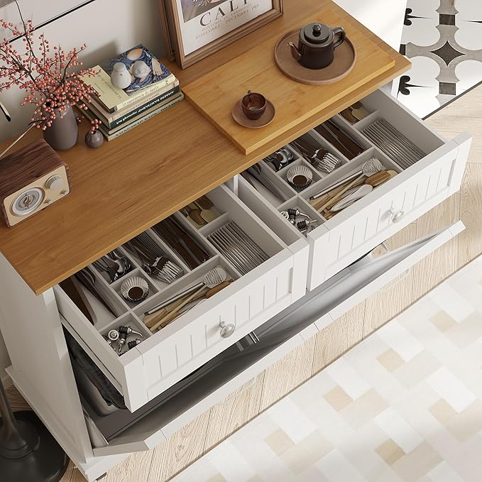 - Thoughtful Farmhouse Touches: Elevate your space with classic striped design and crisp white finish. Metal handles add a polished look, durable enough for daily use. Compact yet spacious, it tucks neatly into corners without sacrificing storage