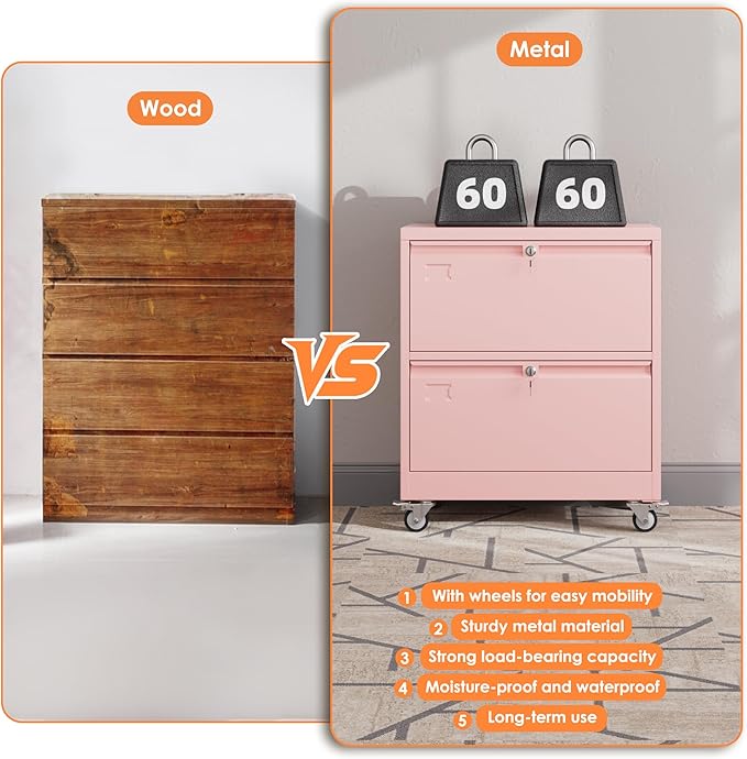 Aobabo Metal 2 Drawer Lateral File Mobile Cabinet with 2 Lock, File Cabinet with Wheels and Adjustable File Bars for Office, Home, for Letter/Legal Size, Pink, Assembly Required