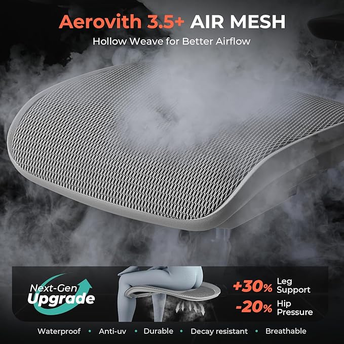 - 【LARGER, COOLER SEAT】The enlarged cushion (19.3"D x 20"W / 18.5"-22.05"H), crafted from exclusive Aerovith Mesh, ensures continuous cooling while enhancing support by 30% and reducing pelvic pressure by 20%.