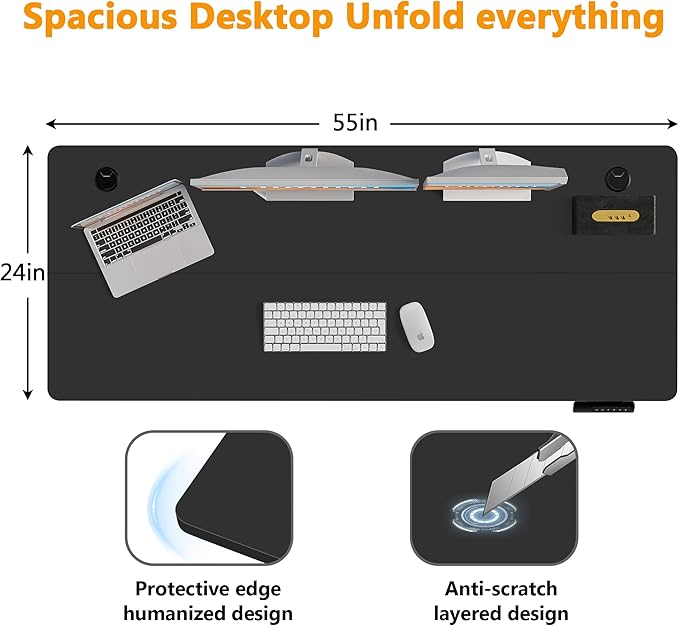 - 【Extra Large Workstation】– Boost productivity with our 55" L x 24" W desktop, providing ample space for monitors, keyboards, and office essentials. Designed for professionals and gamers, this clutter-free desk ensures a smooth workflow for work, design, or gaming. Enjoy functionality and freedom in one versatile workspace