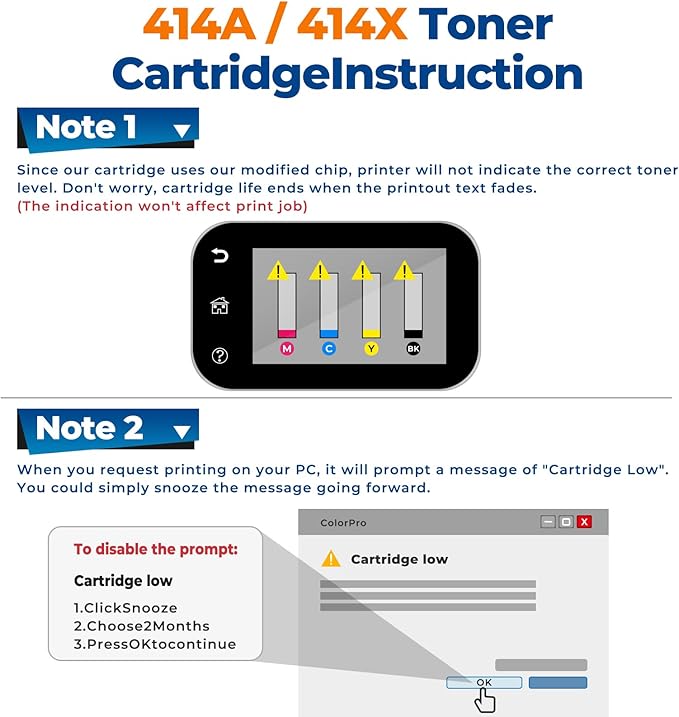 - High Page Yield: Up to 2400 Pages per 414A black toner cartridge, 2100 Pages per 414A Cyan toner cartridge, 414A Magenta toner cartridge, 414A yellow toner cartridge (5% coverage at A4 paper/letter).
